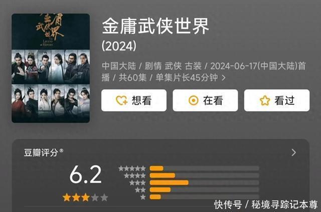 此沙、包上恩主演的《金庸武侠天下》今天豆瓣开分6.2分,“铁血诚心”血扑得其它单位都撤档了,我一经第一次见电视剧播着播着跑路了,剩下的单位不播了?